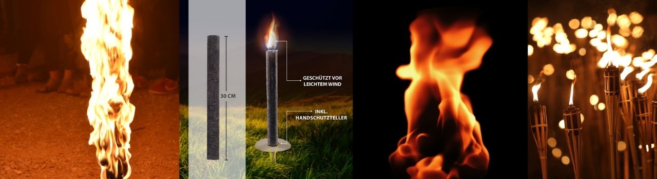 Mit unserem Angebot aus Wachsfackeln und Kerzen bändigst du das Element der Flammen. Diese versprechen ein grosses Spektakel auf deiner Party. Mit den Fackeln können beispielsweise Nachtwanderungen unternommen werden, oder du benutzt sie als einzigartige Lichtquelle. Kerzen sorgen für eine Extraportion Romantik. Überzeuge dich von unserem Angebot und du wirst feststellen, dass du nicht mehr ohne die offenen Lichtquellen kannst.